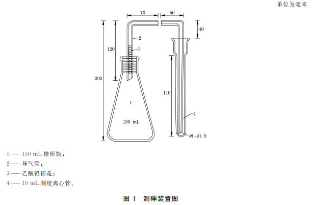 10.4.1砷標準儲備液(100mg/L,按As計):準確稱取于100℃干燥2h的三氧化二砷0.0132g,加100g/L氫氧化鈉溶液1mL和少量水溶解,轉入100mL容量瓶中,加人適量鹽酸調整其酸度近中性,加水稀釋至刻度。4℃避光保存,保存期一年。或購買經國家認證并授予標準物質證書的標準溶液物質。