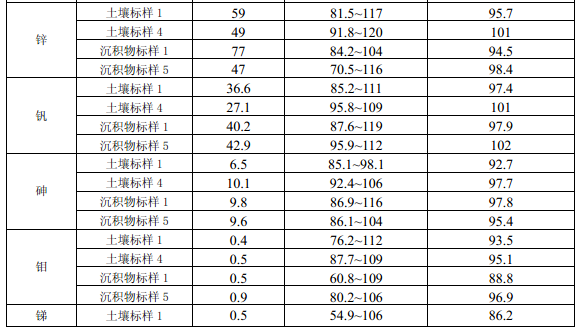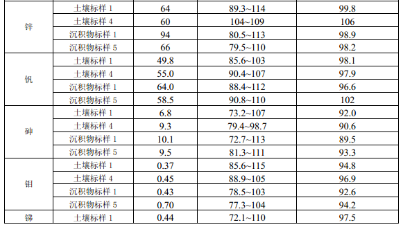 11.4 每批次樣品至少分析10%的加標回收樣,樣品數量小于10個時,應至少做一個加標回收樣。加標回收樣測定結果中,電熱板消解測定鎘(Cd)、鈷(Co)、銅(Cu)、鉻(Cr)、錳(Mn)、鎳(Ni)、鉛(Pb)、鋅(Zn)、釩(V)、砷(As)的加標回收率應控制在70%~125%之間,鉬(Mo)、銻(Sb)的加標回收率應控制在50% ~125%之間;微波消解測定12種金屬元素的加標回收率應控制在70%~125%之間。
