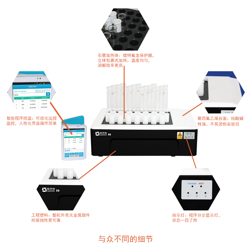 D6智能石墨消解儀采用高純石墨材料作為加熱體,包裹式加熱,效率更高,溫度均勻性更好。多孔設計,輕松實現(xiàn)樣品的批量處理,D6石墨消解儀是您樣品消解的好伴侶。