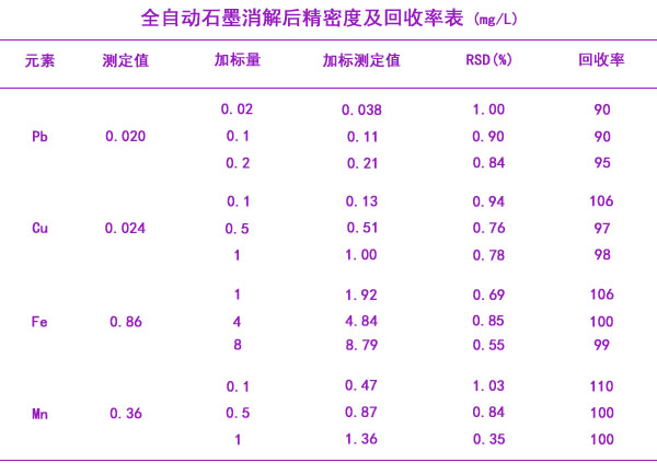 利用全自動石墨消解儀進行三次重復性消解葡萄酒中的鉛、鐵、銅、錳,分析測定精密度及回收率,實驗結(jié)果見表3,以取樣量5mL,定容至25mL計。