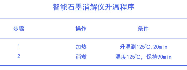 準(zhǔn)確量取0.25g(過(guò)100目篩)土壤樣品于50mL聚四氟乙烯消解管中,加入1mL硝酸溶液、1mL鹽酸溶液及2mL氫氟酸于消解儀中,同時(shí)蓋上蓋子,置于智能石墨消解儀的石墨孔中加熱消解,通過(guò)無(wú)線遠(yuǎn)程平板上的APP預(yù)先設(shè)置程序進(jìn)行消解(消解程序見(jiàn)下列表)。消解樣品程透明狀態(tài),開(kāi)蓋,稍冷,然后定容至50mL。將得到的澄清液稀釋10倍作為液體樣品,待上機(jī)測(cè)定。同時(shí)做空白樣品試驗(yàn)。