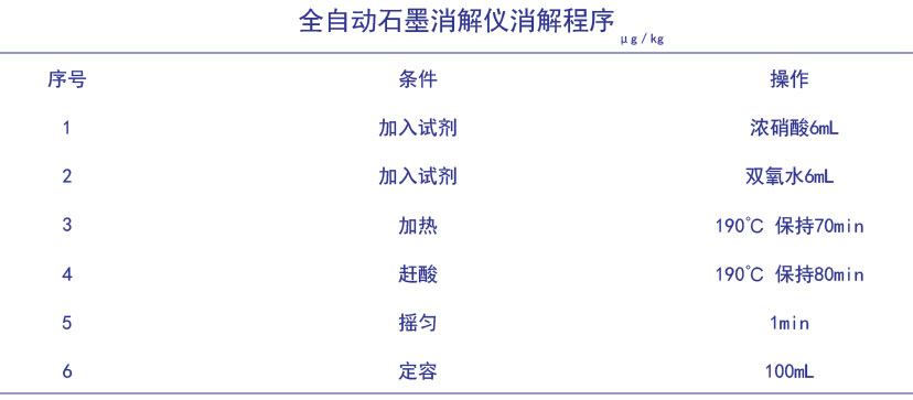 《中國藥典》中有規(guī)定了中藥中鉛、鎘、砷、汞、銅的檢測方法,對于沙星類抗生素中的其它金屬元素殘留未作規(guī)定。本文采用全自動石墨消解儀酸消解方法對樣品進行前處理消解,測定左氧氟沙星膠囊中鉛、鉻、砷、鎘、錫、鋁、鐵7大金屬元素含量。消解儀高程度自動化消解,操作簡單、批處理量大,解放人力繁瑣操作,大大提高工作效率。