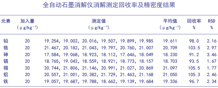 驗證消解方法的回收率與精密度,稱取約0.2g,然后按上面的消解方法進行樣品處理,進行6次平行測定回收率及方法精密度結果如下: