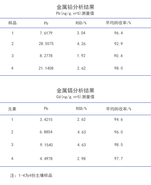 從每個(gè)樣品試液中取3份5mL于50mL容量瓶中,按順序依次分別準(zhǔn)確加0.1、0.2、0.3mLPb/Cd標(biāo)準(zhǔn)溶液(1000ng/mL);用2 %硝酸溶液稀釋定容至刻度線(xiàn),搖勻,得到加標(biāo)混合樣品。同樣品測(cè)定方法進(jìn)行測(cè)定,計(jì)算回收率。