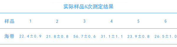 采用本方法對北京市售海帶、(6份)進行測定,測定結果為3次測定的平均值及標準偏差范圍,結果見表格。所測定海帶總砷含量范圍為21.8~56.7mg/kg符合實驗效果。