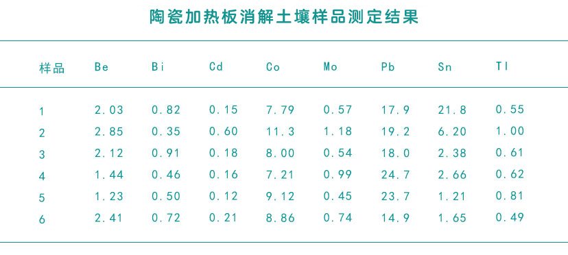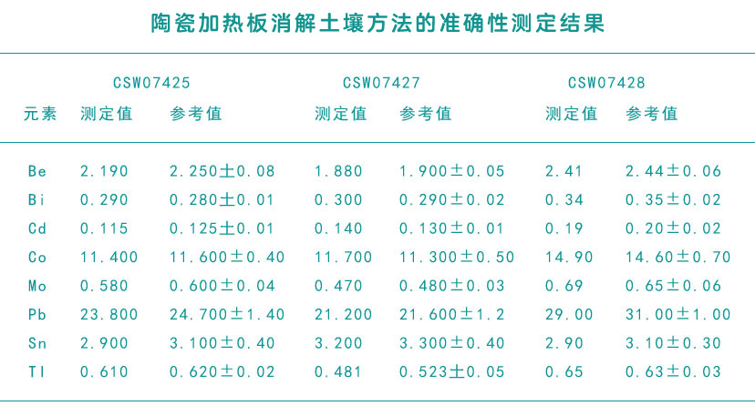 從表中的測定結果得出,三種樣品的重金屬元素測定值均在標準值范圍內,說明陶瓷加熱板消解方法準確度較好。