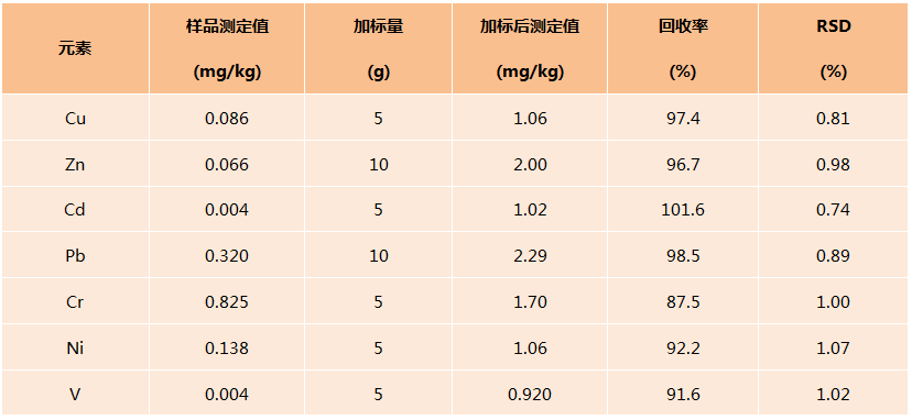 從給中可看出樣品測定精密度為0.86%-1.74%,回收率為85.2%-100.1%,滿足實驗要求,實驗室數據可靠有效,訪方法可用于其它同類樣品的消解。